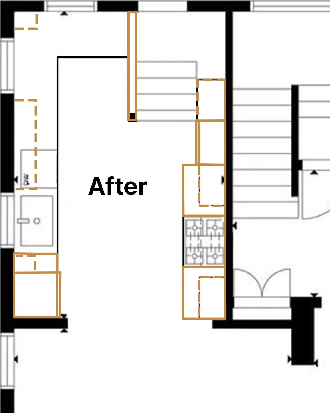 Closing the hallway freed up continuous counter space on both sides of the stove, improved privacy for the downstairs bedroom, and helped contain kitchen noise and smells. Updating the hood and removing the chimney allowed us to fully rework the range wall and add a full-height pantry near the stairs.