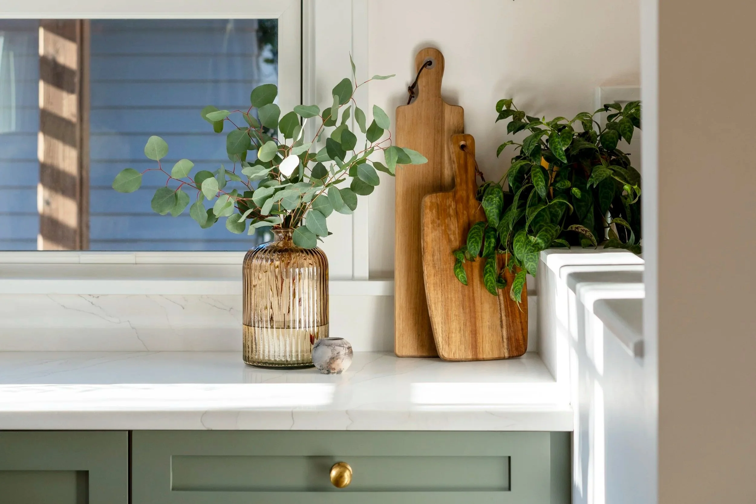 To complement the soft green cabinetry, we introduced terracotta tones and warm wood finishes to add depth without heaviness. In a space with limited natural light, this palette keeps the kitchen grounded and calm.