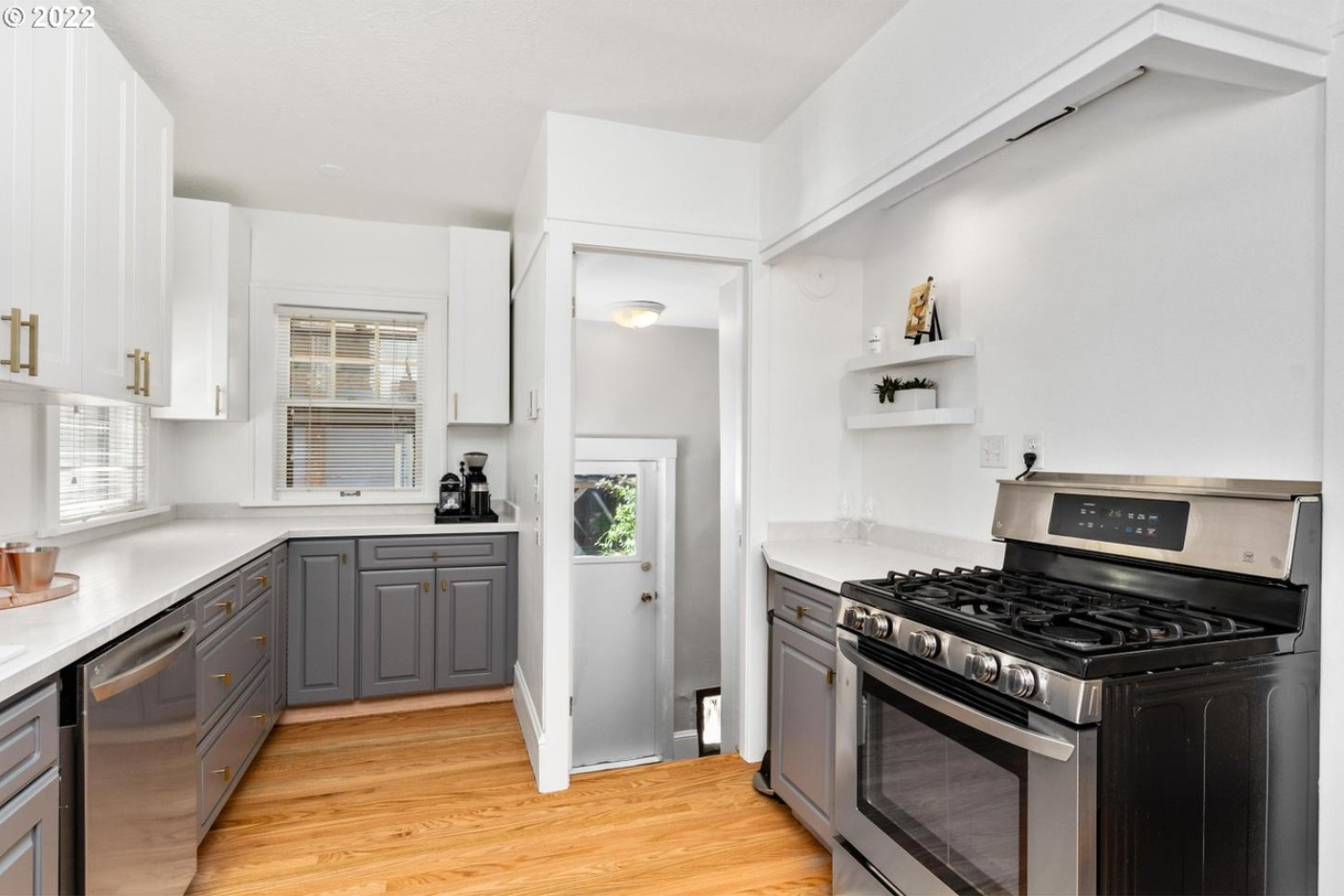 Countertops were chosen based on use: quartz along the main working counter for durability, and butcher block on either side of the range to add warmth and visually connect to the floating shelves opposite. The mix brings balance and character without overcomplicating the space.