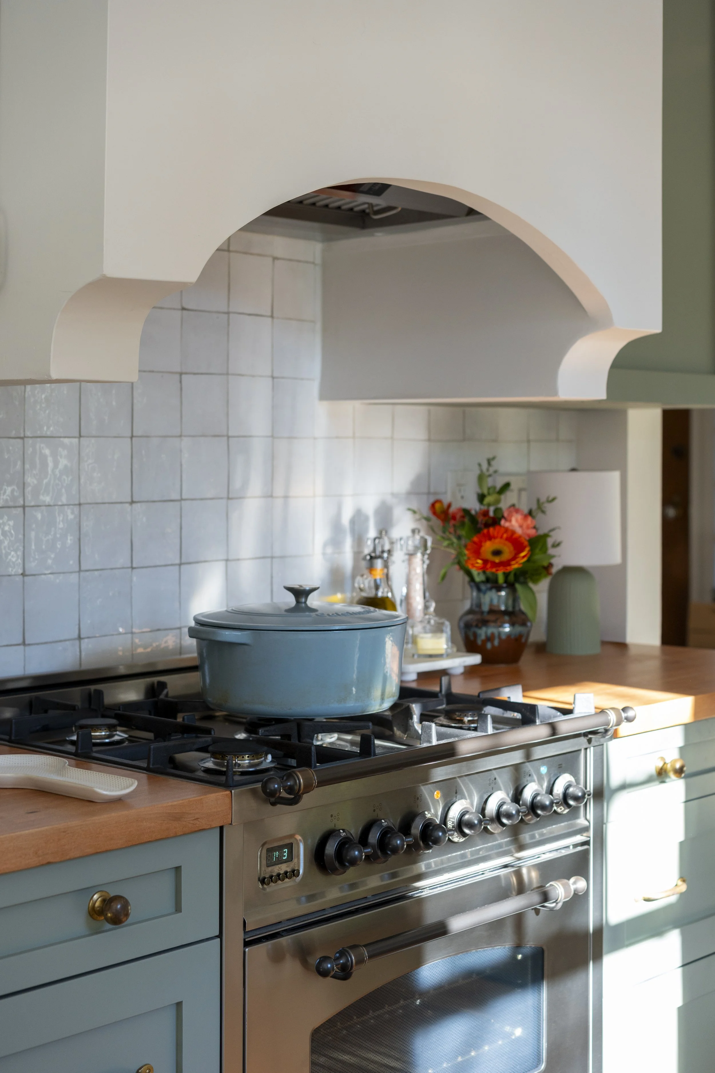The custom range hood, built by my husband Adam, embraces that same philosophy. Slightly imperfect and handmade, it pairs naturally with the terracotta flooring and the zellige tile behind the range, reflecting the reality of a 100-year-old home where very little is perfectly square.