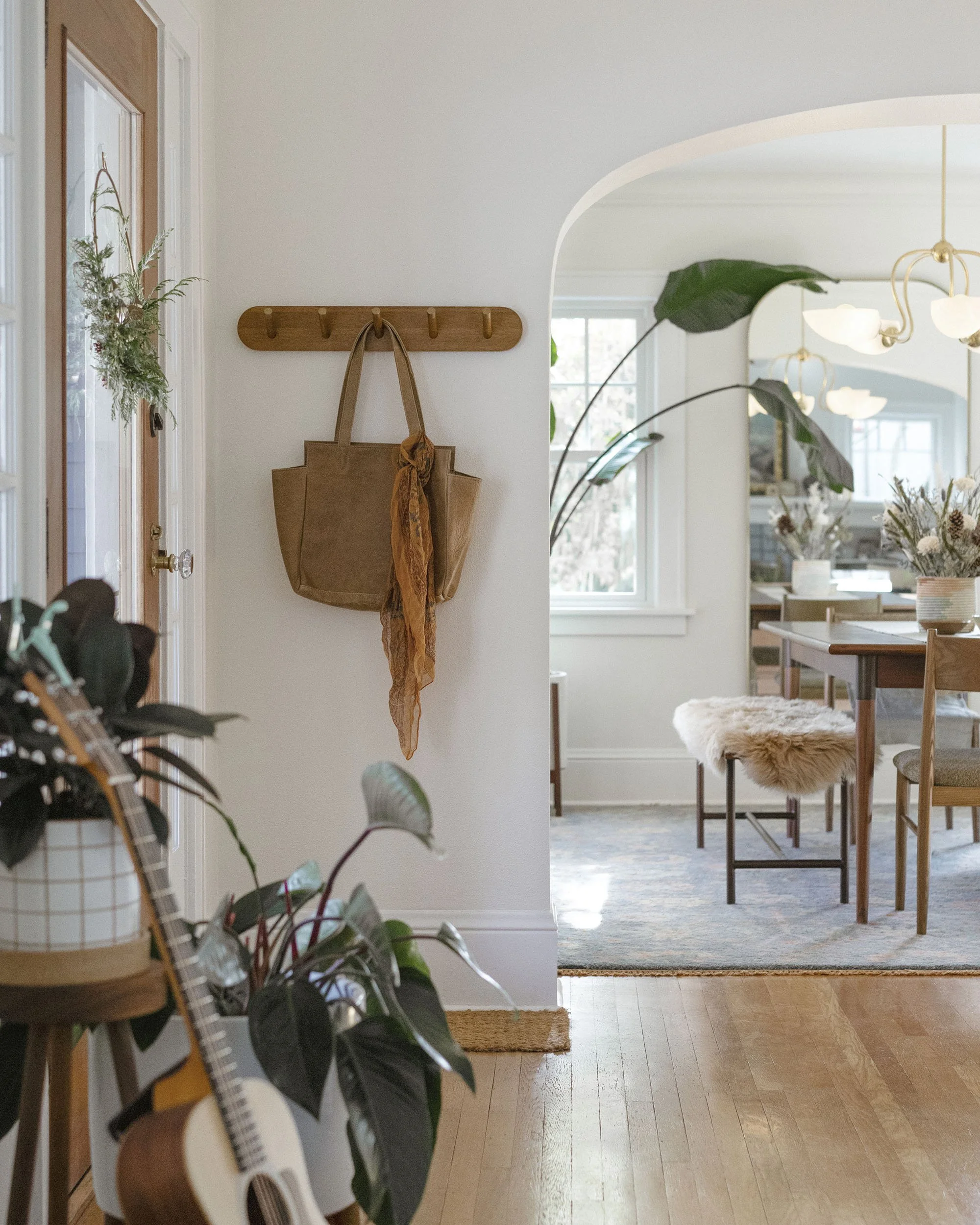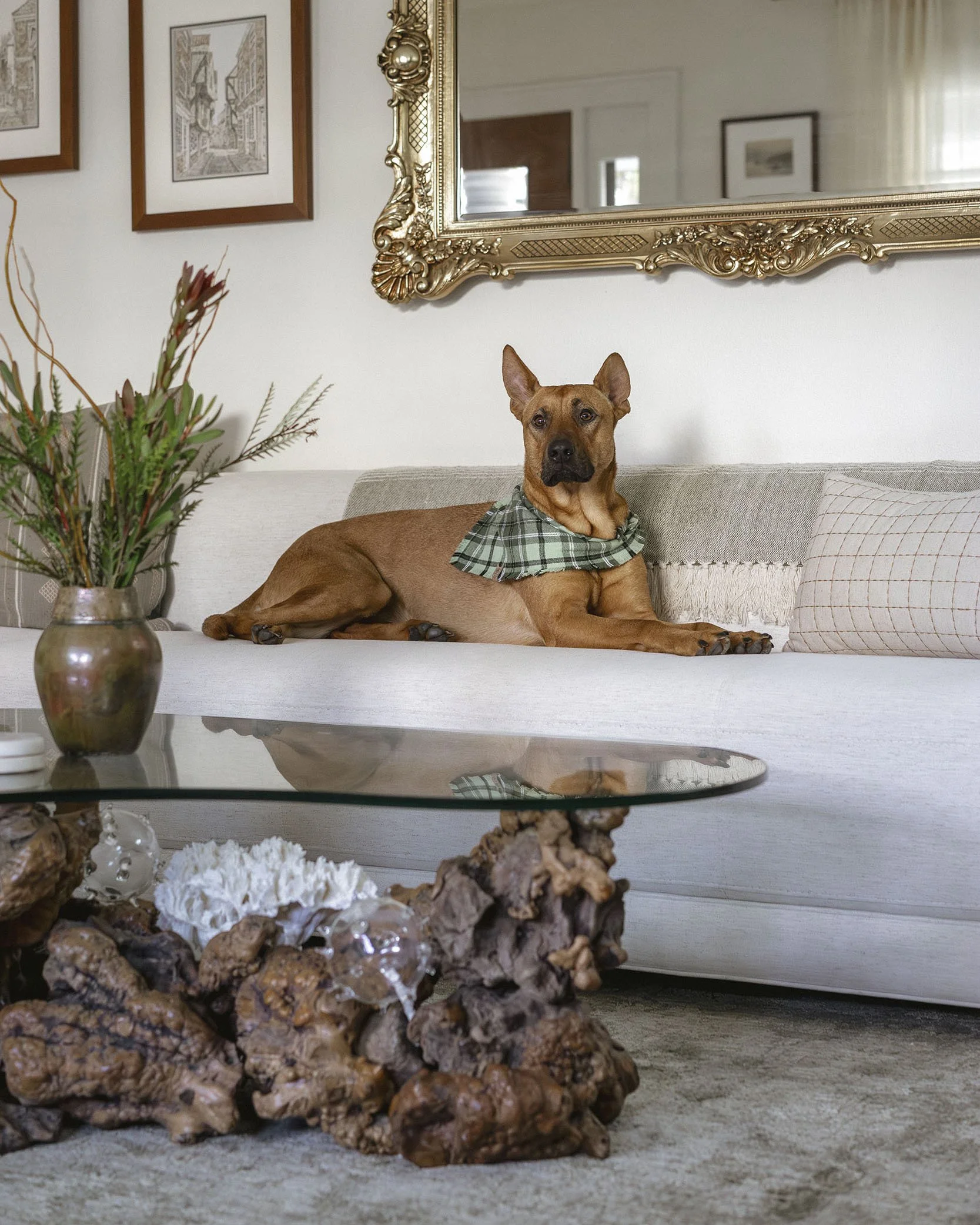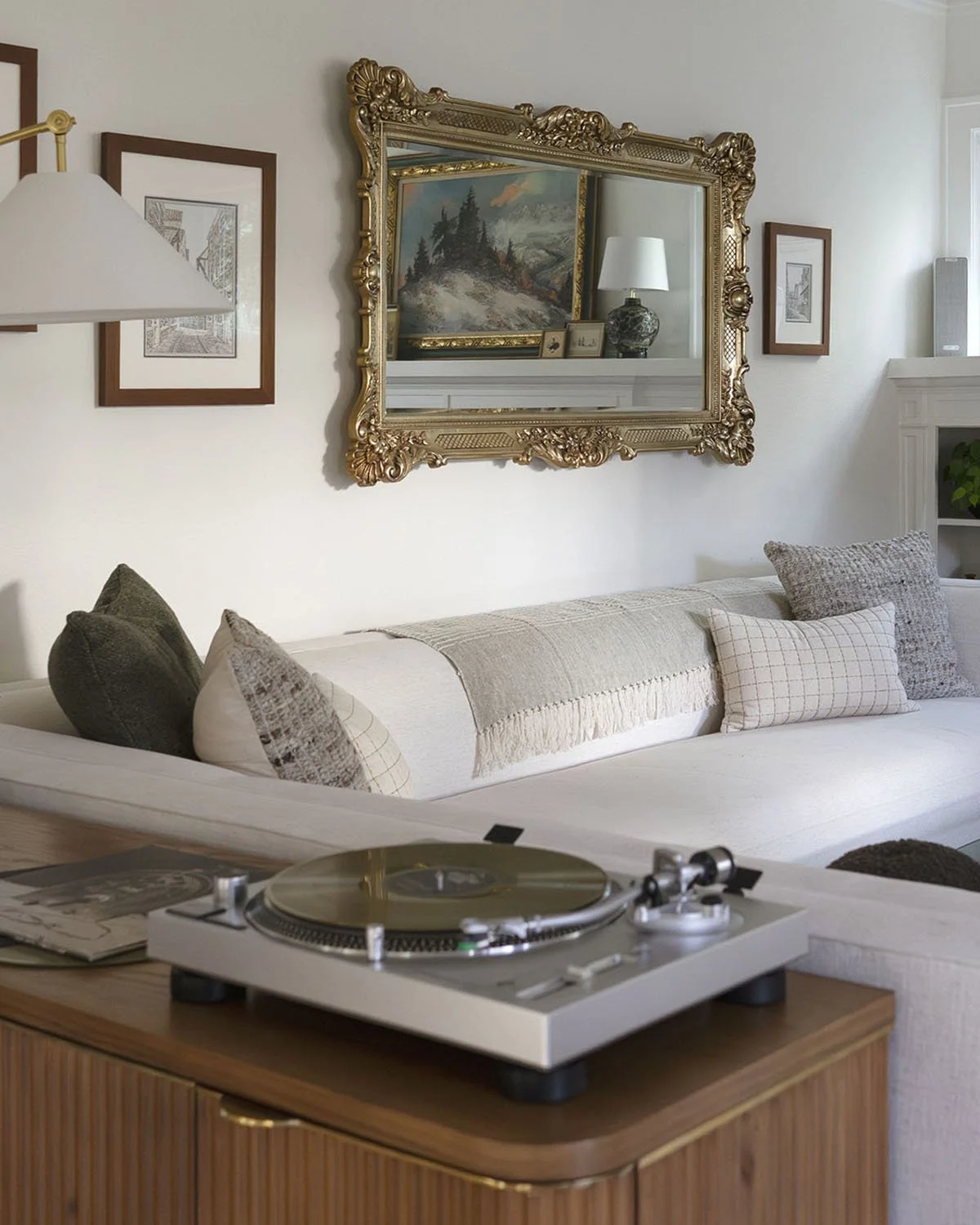 Heirloom pieces played an important role in shaping the room’s character. A 1970s burl wood coffee table with a curved glass top anchors the seating area, paired with a mid-century side table and an ornate brass mirror inherited from the homeowner’s grandmother. These elements introduce a sense of history and familiarity, grounding the space in personal meaning while setting the tone for the rest of the design.