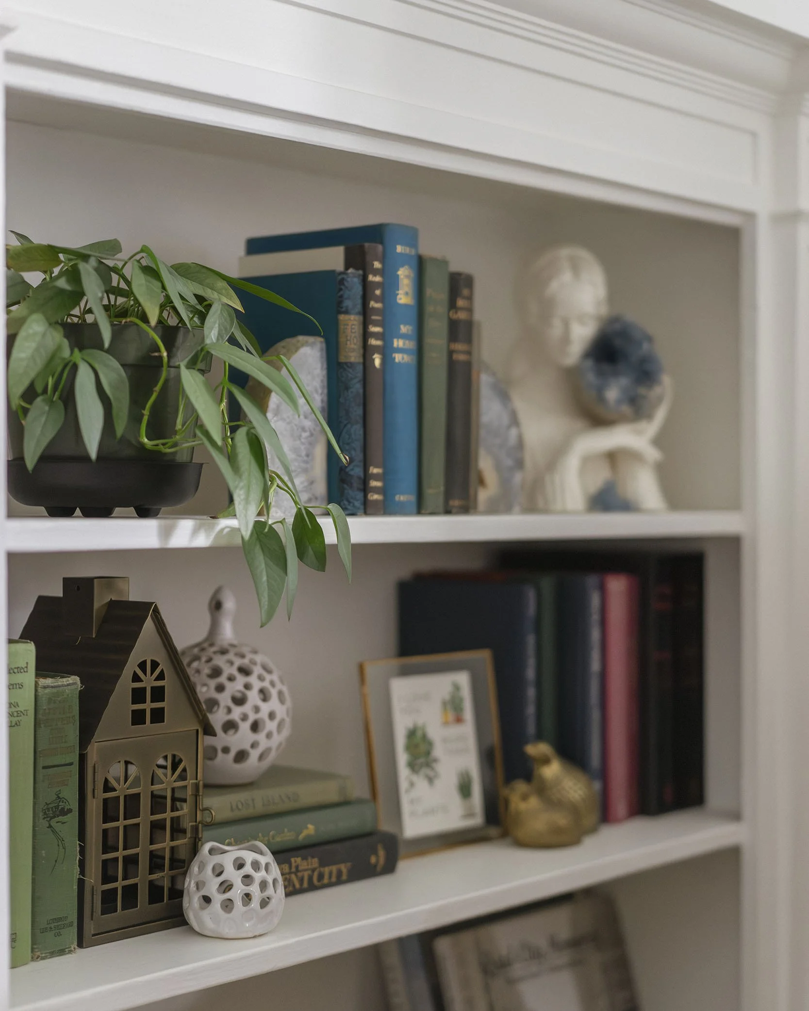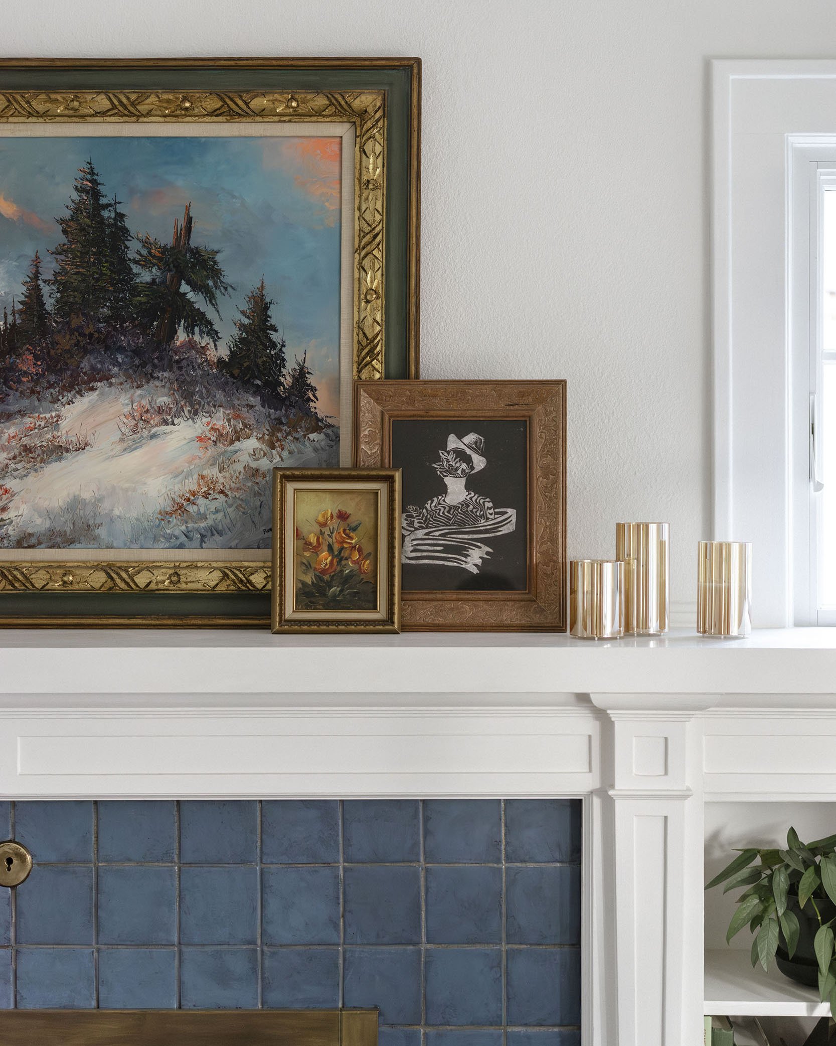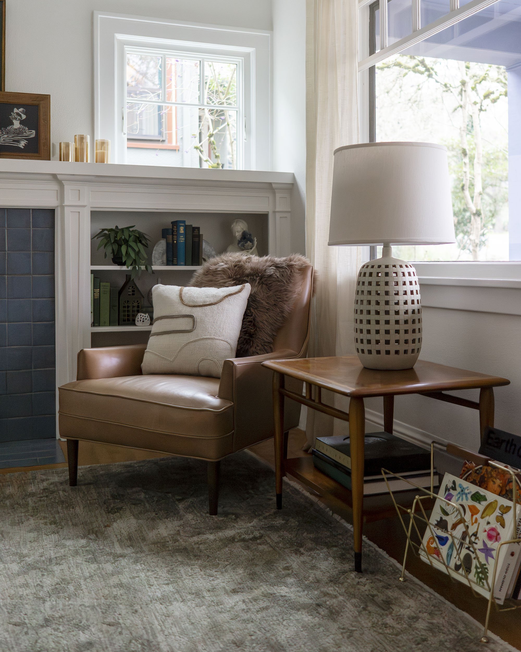 Throughout the room, contrast is used to create balance. Clean lines and right angles—from the mantel to the window frames—are softened by organic shapes found in the coffee table, patterned pillows, and sculptural accents like the curved table lamp. Natural textures and a mix of thrifted and antique finds further layer the space, adding warmth and depth without feeling overly formal.