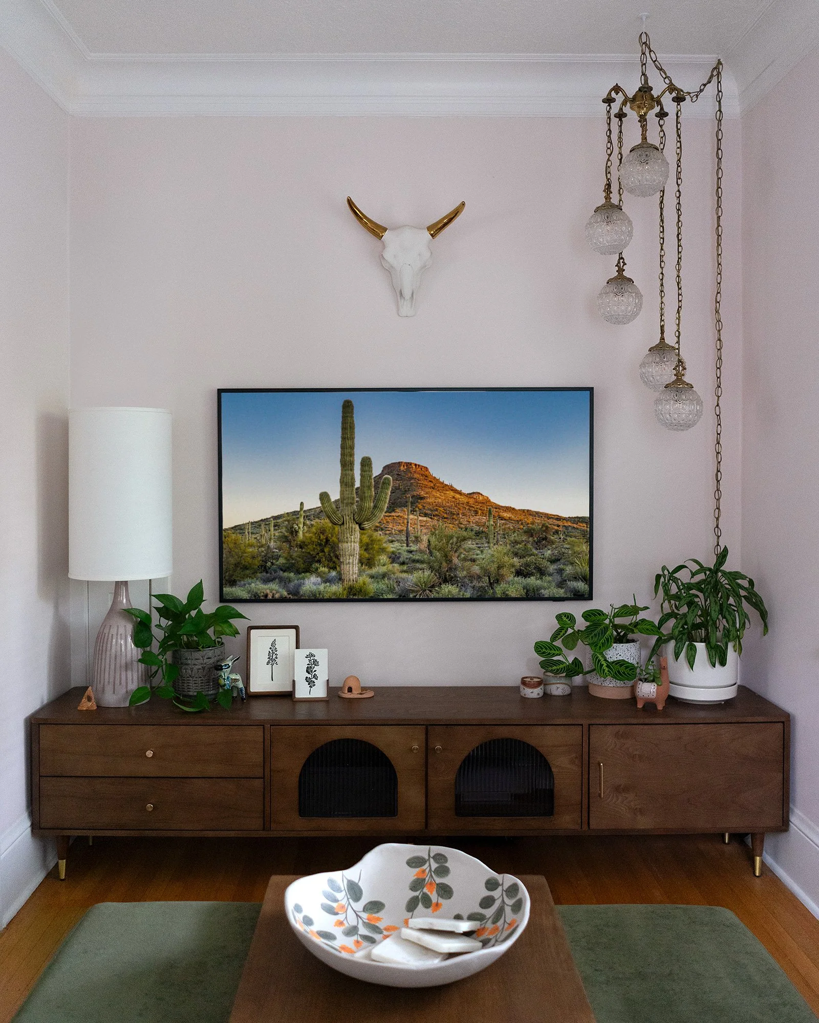 A deep sofa fits snugly wall-to-wall, paired with a walnut veneer coffee table and tucked-away ottomans that double as extra seating. Across from it, a walnut console anchors the TV wall with a built-in feel, while vintage lighting and layered artwork — from desert photography to collected travel mementos — add personality and charm.