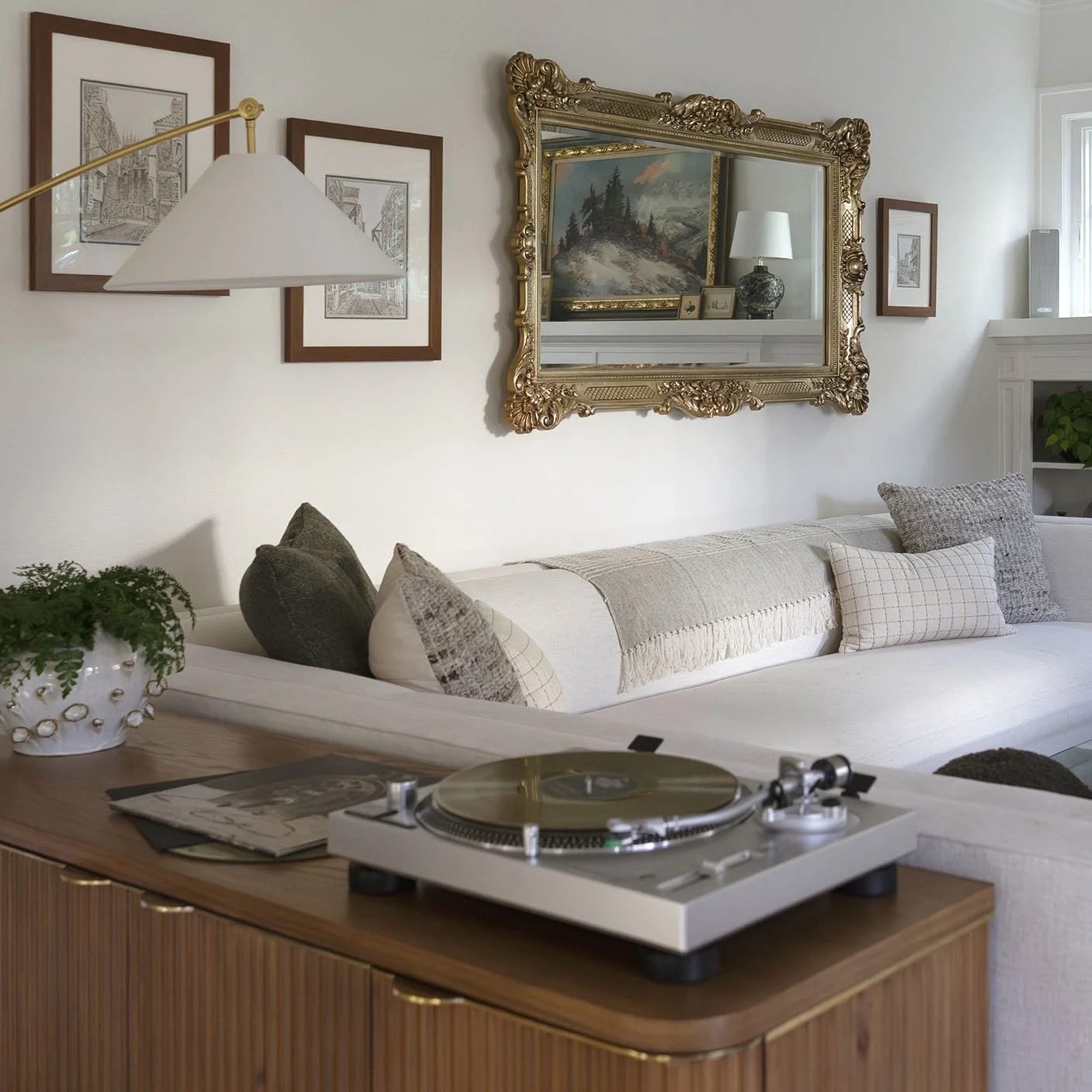 "Introduce a few 'heavy' visual anchors, like a dark wood console, a vintage mirror, or dark velvet pillows. This creates the highlights and lowlights necessary for a space to feel layered," she says.